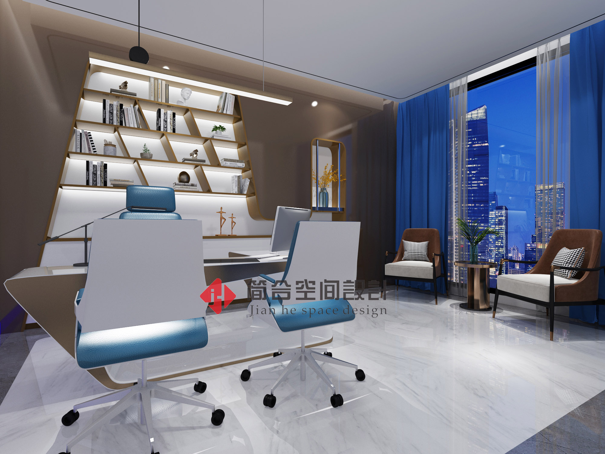 利落的曲线,光泽的表面,大面的留白扩充视觉效果,晶莹剔透的玻璃镜折射出Tiffany蓝的风采,似有似无,朦胧缥缈,融合现代的简洁风格和趣味元素,以一种有趣的视角,重新定义大厅的形态。